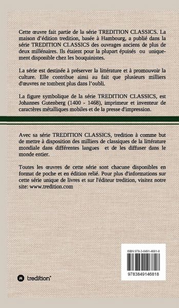 Cette uvre (édition relié) fait partie de la série TREDITION CLASSICS. La maison d édition tredition, basée à Hambourg, a publié dans la série TREDITION CLASSICS des ouvrages anciens de plus de deux millénaires. Ils étaient pour la plupart épuisés ou uniquement disponible chez les bouquinistes. La série est destinée à préserver la littérature et à promouvoir la culture. Avec sa série TREDITION CLASSICS, tredition à comme but de mettre à disposition des milliers de classiques de la littérature mondiale dans différentes langues et de les diffuser dans le monde entier.