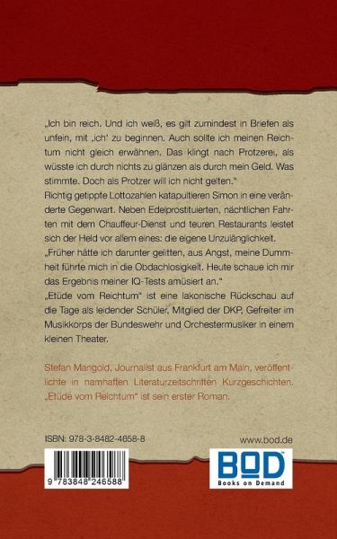 "Ich bin reich. Und ich weiß, es gilt zumindest in Briefen als unfein, mit 'ich' zu beginnen. Auch sollte ich meinen Reichtum nicht gleich erwähnen. Das klingt nach Protzerei, als wüsste ich durch nichts zu glänzen als durch mein Geld. Was stimmte. Doch als Protzer will ich nicht gelten." Richtig getippte Lottozahlen katapultieren Simon in eine veränderte Gegenwart. Neben Edelprostituierten, nächtlichen Fahrten mit dem Chauffeur-Dienst und teuren Restaurants leistet sich der Held vor allem eines: die eigene Unzulänglichkeit."Früher hätte ich darunter gelitten, aus Angst, meine Dummheit führte mich in die Obdachlosigkeit. Heute schaue ich mir das Ergebnis meiner IQ-Tests amüsiert an.""Etüde vom Reichtum" ist eine lakonische Rückschau auf die Tage als leidender Schüler, Mitglied der DKP, Gefreiter im Musikkorps der Bundeswehr und Orchestermusiker in einem kleinen Theater.