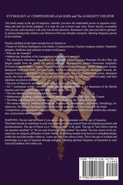 ETYMOLOGY of COMPENDIUMS of all GODS and The ALMIGHTY CREATOR. Some synopsis unfolded in this book include but not limited to:Future of Artificial Intelligence (AI) robots, Cryptocurrencies, Nuclear weapons (nukes), Nanotechnologies, Medicine and solutions to attain world peace. The Anunaki's origin and real identity. The massive land masses (extra terrestrial) beyond the ice wall in Antarctica. Modern-day bloodline of the Anunaki's location on earth revealed. The aboriginal Akkadians, descendants of all ancient Kemet/Egyptian Pharoahs (Fre-RA-Wo), the Dogon people from the Sirius star galaxy universe, Mesopotamia, ancient Sumerians (originally El-Zuma/Zuma in today's Sudan), Yoruba/Oruba/Euroba/Europa/Europe, Moors, aboriginal Asians, aboriginal North and South Amerika/Tameri, Afraka/Aeothiopia/Alkebullan, aboriginal Oceania, aboriginal Antarctica, aboriginal Atlantis, aboriginal Pangaea, first ever greatest civilizations, aboriginal royals, the Gods and Goddesses, and all so-called super heroes are still alive and well today with their identities unveiled in this book. Doctrine of Discovery and solutions to remedy its global damages. All 7 continental worlds' Artifacts, books and documents hidden at the basements of the British museum and Vatican's 53 miles (85 kilometers) secret library. Mathematics, numbers, science, spirituality, and linguistic connection to the true Creator. The Bible and Quran God versus the original Almighty Creator. Revealing the hidden identity of the real Almighty Creator buried by both the Bible and Quran. The names of the true founders of Medicine, Engineering, Mathematics, Astronomy, Metallurgy, Architecture, Navigation, Aerospace, and all inventions under the sun are revealed in this book. Geopolitical, geoeconomical, and psycho-religious manipulations married with modern day colonialism, enslavement and imperialism. This book intends to cure you from all religious psychosis and psychosomatics.