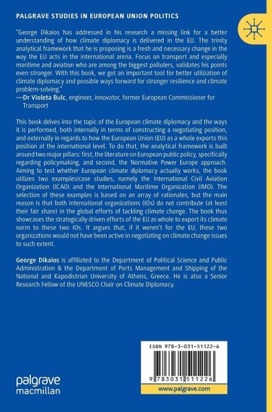 This book delves into the topic of the European climate diplomacy and the ways it is performed, both internally in terms of constructing a negotiating position, and externally in regards to how the European Union (EU) as a whole exports this position at the international level. To do that, the analytical framework is built around two major pillars: first, the literature on European public policy, specifically regarding policymaking, and second, the Normative Power Europe approach. Aiming to test whether European climate diplomacy actually works, the book utilizes two examples/case studies, namely the International Civil Aviation Organization (ICAO) and the International Maritime Organization (IMO). The selection of these examples is based on an array of rationales, but the main reason is that both international organizations (IOs) do not contribute (at least their fair share) in the global efforts of tackling climate change. The book thus showcases the strategically driven efforts of the EU as whole to export its climate norm to these two IOs. It argues that, if it weren't for the EU, these two organizations would not have been active in negotiating on climate change issues to such extent.