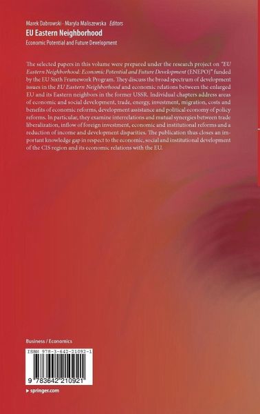 The selected papers in this volume were prepared under the research project on "EU Eastern Neighborhood: Economic Potential and Future Development (ENEPO)" funded by the EU Sixth Framework Program. They discuss the broad spectrum of development issues in the EU Eastern Neighborhood and economic relations between the enlarged EU and its Eastern neighbors in the former USSR. Individual chapters address areas of economic and social development, trade, energy, investment, migration, costs and benefits of economic reforms, development assistance and political economy of policy reforms. In particular, they examine interrelations and mutual synergies between trade liberalization, inflow of foreign investment, economic and institutional reforms and a reduction of income and development disparities. The publication thus closes an important knowledge gap in respect to the economic, social and institutional development of the CIS region and its economic relations with the EU.