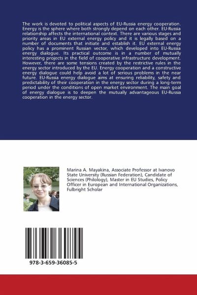 The work is devoted to political aspects of EU-Russia energy cooperation. Energy is the sphere where both strongly depend on each other. EU-Russia relationship affects the international context. There are various stages and priority areas in EU external energy policy and it is legally based on a number of documents that initiate and establish it. EU external energy policy has a prominent Russian vector, which developed into EU-Russia energy dialogue. Its practical outcome is in a number of mutually interesting projects in the field of cooperative infrastructure development. However, there are some tensions created by the restrictive rules in the energy sector introduced by the EU. Energy cooperation and a constructive energy dialogue could help avoid a lot of serious problems in the near future. EU-Russia energy dialogue aims at ensuring reliability, safety and predictability of their cooperation in the energy sector during a long-term period under the conditions of open market environment. The main goal of energy dialogue is to deepen the mutually advantageous EU-Russia cooperation in the energy sector.