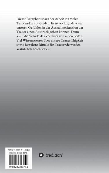 Ratgeber mit bewährten Ritualen zur Trauerbewältigung. Aus der Arbeit mit hunderten Trauernden ist dieses Buch für Ratsuchende trauernde Menschen geschrieben. Viel Wissen über die Ausnahmesituation der Trauer und über die Wichtigkeit, einen Ausdruck für unsere Trauer zu finden, wird hier vermittelt. Alle Gefühle dürfen sein, doch erst die Annahme der Trauer wird den Weg zur Heilung weisen.