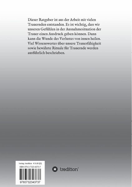 Ratgeber mit bewährten Ritualen zur Trauerbewältigung. Aus der Arbeit mit hunderten Trauernden ist dieses Buch für Ratsuchende trauernde Menschen geschrieben. Viel Wissen über die Ausnahmesituation der Trauer und über die Wichtigkeit, einen Ausdruck für unsere Trauer zu finden, wird hier vermittelt. Alle Gefühle dürfen sein, doch erst die Annahme der Trauer wird den Weg zur Heilung weisen.