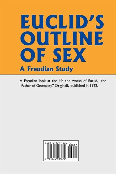 Euclid's Outline of Sex is a Freudian look at the life and works of Euclid." Originally published in 1922. Euclid, often referred to as the "Father of Geometry," was an ancient Greek mathematician who lived around 300 BCE. His most famous work, Elements, is a comprehensive compilation of the mathematical knowledge of his time, and it laid the foundation for what is now known as Euclidean geometry.
