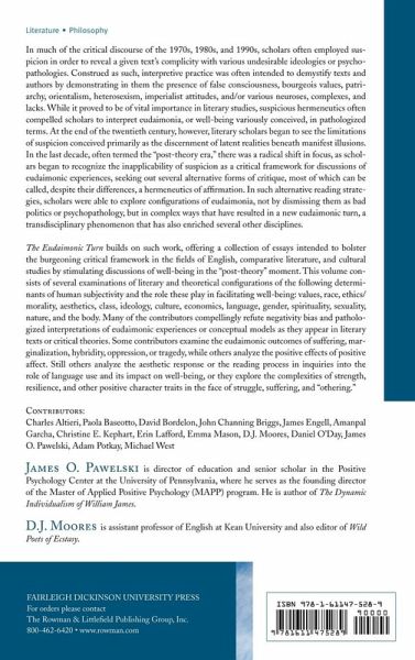 Acknowledgments Foreword: Adam Potkay Introduction Part 1: James Pawelski-What Is the Eudaimonic Turn? Introduction Part 2: D. J. Moores-The Eudaimonic Turn in Literary Studies 1.Charles Altieri-Pound's Challenge to Ranciere's Treatment of the "Aesthetic Regime": Why Nietzsche is Necessary for a Positive Account of Modernism in the Arts 2.James Engell-Thoreau and Health: Physician, Naturalist, Metaphysician 3.Erin Lafford and Emma Mason-Falling from Trees: Arborescent Prosody in John Clare's Tree Elegies 4.John Channing Briggs-Happiness, Catharsis, and the Literary Cure 5.Michael West-Ramblers, Hikers, Vagabonds, and Flâneurs: America's Peripatetic Romantics and the Rituals of Healthy Walking 6.Paola Baseotto-Spenser's "virtuous . . . discipline" and Human Flourishing 7.Amanpal Garcha-The Choices of Can You Forgive Her?:Literary Realism, Freedom, and Contentment 8.David Bordelon-The Crosses We Bear: Religion, Readers, and Woman's Intellect in Augusta Jane Evans' St. Elmo 9.