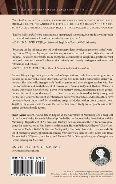 Contributions by Jacob Agner, Sarah Gilbreath Ford, Katie Berry Frye, Michael Kreyling, Andrew B. Leiter, Rebecca Mark, Suzanne Marrs, Tom Nolan, Michael Pickard, Harriet Pollack, and Victoria Richard Eudora Welty's ingenious play with readers' expectations made her a cunning writer, a paramount modernist, a short story artist of the first rank, and a remarkable literary innovator. In her signature puzzle-texts, she habitually engages with familiar genres and then delights readers with her transformations and nonfulfillment of conventions. Eudora Welty and Mystery: Hidden in Plain Sight reveals how often that play is with mystery, crime, and detective fiction genres, popular fiction forms often condescended to in literary studies, but unabashedly beloved by Welty throughout her lifetime. Put another way, Welty often creates her stories' secrets by both evoking and displacing crime fiction conventions. Instead of restoring order with a culminating reveal, her story-puzzles characteristically allow mystery to linger and thicken. The mystery pursued becomes mystery elsewhere. The essays in this collection shift attention from narratives, characters, and plots as they have previously been understood by unearthing enigmas hidden within those constructions. Some of these new readings continue Welty's investigation of hegemonic whiteness and southern narratives of race--outlining these in chalk as outright crime stories. Other essays show how Welty anticipated the regendering of the form now so characteristic of contemporary women mystery writers. Her tender and widely ranging personal correspondence with the hard-boiled American crime writer Ross Macdonald is also discussed. Together these essays make the case that across her career, Eudora Welty was arguably one of the genre's greatest double agents, and, to apply the titles of Macdonald's novels to her inventiveness with the form, she is its "underground woman," its unexpected "sleeping beauty."
