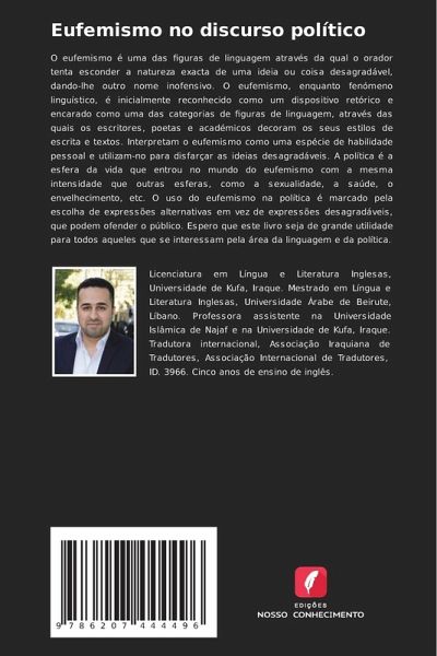 O eufemismo é uma das figuras de linguagem através da qual o orador tenta esconder a natureza exacta de uma ideia ou coisa desagradável, dando-lhe outro nome inofensivo. O eufemismo, enquanto fenómeno linguístico, é inicialmente reconhecido como um dispositivo retórico e encarado como uma das categorias de figuras de linguagem, através das quais os escritores, poetas e académicos decoram os seus estilos de escrita e textos. Interpretam o eufemismo como uma espécie de habilidade pessoal e utilizam-no para disfarçar as ideias desagradáveis. A política é a esfera da vida que entrou no mundo do eufemismo com a mesma intensidade que outras esferas, como a sexualidade, a saúde, o envelhecimento, etc. O uso do eufemismo na política é marcado pela escolha de expressões alternativas em vez de expressões desagradáveis, que podem ofender o público. Espero que este livro seja de grande utilidade para todos aqueles que se interessam pela área da linguagem e da política.