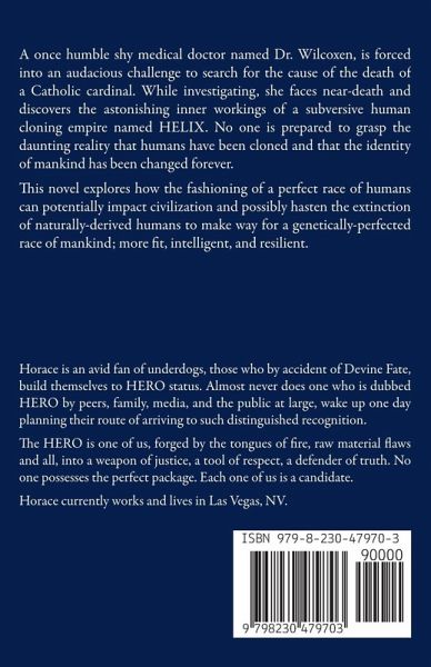 A once humble shy medical doctor named Dr.Wilcoxen is forced into an audacious challenge to search for the cause of the death of a Catholic cardinal. While investigating, she faces near death attempts on her life and discovers the astonishing inner workings of a subversive human cloning empire named HELIX. No one is prepared to grasp the daunting reality that humans have been cloned and that the identity of mankind has been changed forever. This novel explores how the fashioning of a perfect race of humans can potentially impact civilization and possibly hasten the extinction of naturally-derived humans to make way for a race of mankind; more fit, intelligent, and resilient.