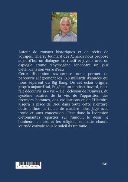 Cette discussion savoureuse nous permet de parcourir allègrement les 13,8 milliards d'années qui nous séparent du Big Bang. De cet éclair originel jusqu'à aujourd'hui, Eugène, un tantinet bavard, nous fait découvrir sa « vie ». De l'éclosion de l'Univers, du système solaire, de la vie, de l'apparition des premiers hommes, des civilisations et de l'Histoire, jusqu'à la place de Dieu dans toute cette aventure, cette infime particule de matière nous juge avec ironie et sans concession. C'est donc là l'occasion d'étonnantes réparties sur l'amour, le désir, le bonheur, la mort et les religions en cette chaude journée estivale sous le soleil d'Occitanie...