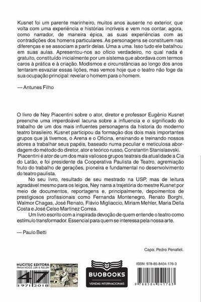 O livro de Ney Piacentini sobre o ator, diretor e professor Eugênio Kusnet preenche uma imperdoável lacuna sobre a influencia e o significado do trabalho de um dos mais influentes personagens da historia do moderno teatro brasileiro. Kusnet participou da formação dos dois mais importantes grupos que já tivemos, o Arena e o Oficina, ensinando e treinando nossos atores a trabalhar seus papéis, baseado numa peculiar e meticulosa abordagem do método do diretor, ator e teórico russo, Constantin Stanislasvski. Piacentini é ator de um dos mais valiosos grupos teatrais da atualidade a Cia do Latão, e foi presidente da Cooperativa Paulista de Teatro, agremiação fruto do trabalho de gerações, pioneira e fundamental no desenvolvimento do teatro paulista. Ney narra a trajetória do mestre Kusnet por meio de documentos, reportagens e, principalmente, depoimentos de prestigiosos profissionais como Fernanda Montenegro, Renato Borghi, Walmor Chagas, José Renato, Flávio Migliaccio, Miriam Mehler, Maria Della Costa e José Celso Martinez Correa. Um livro escrito com a inspirada devoção de quem entende o teatro como estímulo transformador. Essencial para quem se interessa pela nossa arte. ¿ Paulo Betti