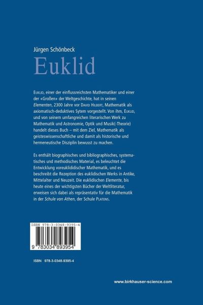 Euklid, der Geometer aus Alexandria, und sein uberwiegend geometrisches literarisches Werk bilden den Mittelpunkt dieses Buches zur Geschichte derMathematik. Es ist bis heute nicht mit letzter Sicherheit geklart, ob eseinen Mathematiker mit dem Namen Euklid wirklich gegeben, wann er gelebthat und ob die ihm zugeschriebenen Lehrbucher zur Mathematik und zurmathematischen Physik tatsachlich nur von ihm verfasst wurden. Trotz dieserEinschrankungen breitet der Autor das derzeit verfugbare Wissen uber dievoreuklidische griechische Mathematik, die Traditionslinien dereuklidischen Geometrie und die uber Jahrhunderte andauerndeWirkungsgeschichte der euklidischen Werke umfassend aus. Dabei wird anvielen Stellen deutlich, wie unzureichend unsere Kenntnisse uber dieRezeptionsgeschichte und wie luckenhaft das antike Quellenmaterial auch nach zweitausend Jahren immer noch sind. Das Buch spurt den vielfaltigenhistorischen und interkulturellen Aspekten und Facetten der Mathematiknach.