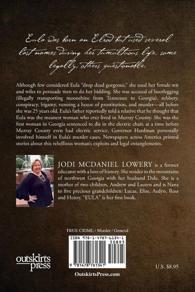 Eula was born an Elrod but used several last names during her tumultuous life, some legally, others questionable. Although few considered Eula "drop dead gorgeous," she used her female wit and wiles to persuade men to do her bidding. She was accused of bootlegging (illegally transporting moonshine from Tennessee to Georgia), robbery, conspiracy, bigamy, running a house of prostitution, and murder-all before she was 25 years old. Eula's father reportedly told a relative that he thought that Eula was the meanest woman who ever lived in Murray County. She was the first woman in Georgia sentenced to die in the electric chair, at a time before Murray County even had electric service. Governor Hardman personally involved himself in Eula's murder cases. Newspapers across America printed stories about this rebellious woman's exploits and legal entanglements.