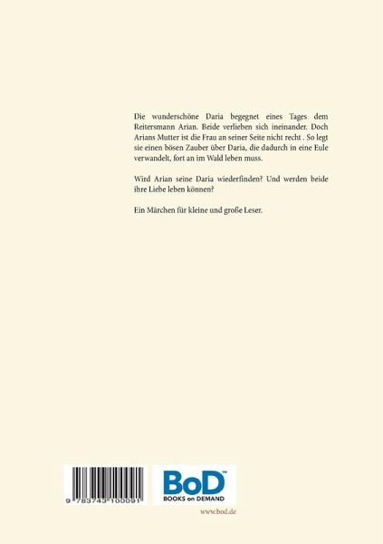 Die wunderschöne Daria begegnet eines Tages dem Reitersmann Arian. Beide verlieben sich ineinander. Doch Arians Mutter ist die Frau an seiner Seite nicht recht. So legt sie einen bösen Zauber über Daria, die dadurch in eine Eule verwandelt, fort an im Wald leben muss.Wird Arian seine Daria wiederfinden? Und werden beide ihre Liebe leben können?Ein Märchen für kleine und große Leser.