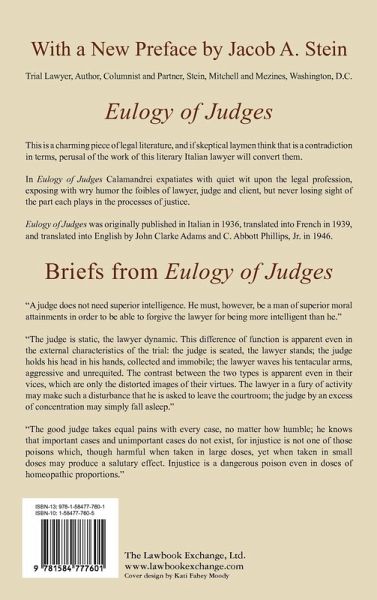 Reprint of the first American edition. First published in Italian in 1936, Elogio dei Giudici Scritto da un Avvocato, this is a collection of maxims, anecdotes and observations on the nature of law and justice by a professor of legal procedure at the University of Florence. Some chapters are: On the Faith of Judges, The Prime Requisite of Lawyers; On Etiquette (Or Discretion) in The Court; On the Relationship Between the Lawyer and the Truth, or on the Necessary Partisanship of the Lawyer. With a new preface by Jacob A. Stein, prominent Washington D.C. trial lawyer and author of Eulogy of Lawyers (2010), Legal Spectator & More (2003) and other titles.
