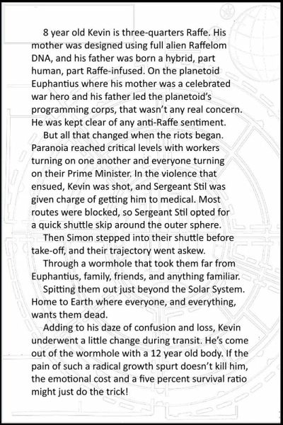 8 year old Kevin is three-quarters Raffe. His mother was designed using full alien Raffelom DNA, and his father was born a hybrid, part human, part Raffe-infused. On the planetoid Euphantius where his mother was a celebrated war hero and his father led the planetoid's programming corps, that wasn't any real concern. He was kept clear of any anti-Raffe sentiment. But all that changed when the riots began. Paranoia reached critical levels with workers turning on one another and everyone turning on their Prime Minister. In the violence that ensued, Kevin was shot, and Sergeant Stil was given charge of getting him to medical. Most routes were blocked, so Sergeant Stil opted for a quick shuttle skip around the outer sphere. Then Simon stepped into their shuttle before take-off, and their trajectory went askew. Through a wormhole that took them far from Euphantius, family, friends, and anything familiar. Spitting them out just beyond the Solar System. Home to Earth where everyone, and everything, wants them dead. Adding to his daze of confusion and loss, Kevin underwent a little change during transit. He's come out of the wormhole with a 12 year old body. If the pain of such a radical growth spurt doesn't kill him, the emotional cost and a five percent survival ratio might just do the trick!