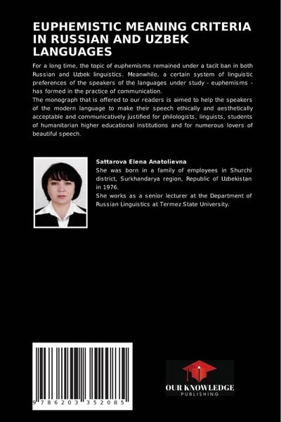 For a long time, the topic of euphemisms remained under a tacit ban in both Russian and Uzbek linguistics. Meanwhile, a certain system of linguistic preferences of the speakers of the languages under study - euphemisms - has formed in the practice of communication.The monograph that is offered to our readers is aimed to help the speakers of the modern language to make their speech ethically and aesthetically acceptable and communicatively justified for philologists, linguists, students of humanitarian higher educational institutions and for numerous lovers of beautiful speech.