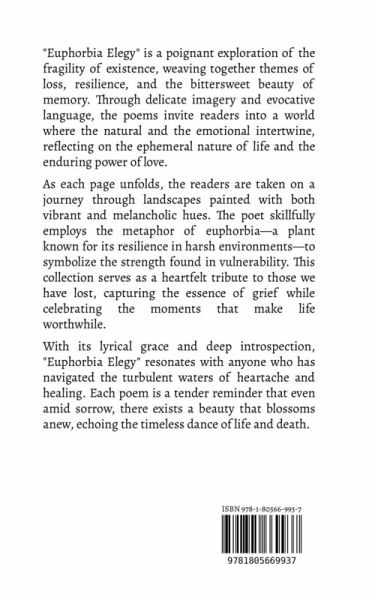 "Euphorbia Elegy" is a poignant exploration of the fragility of existence, weaving together themes of loss, resilience, and the bittersweet beauty of memory. Through delicate imagery and evocative language, the poems invite readers into a world where the natural and the emotional intertwine, reflecting on the ephemeral nature of life and the enduring power of love. As each page unfolds, the readers are taken on a journey through landscapes painted with both vibrant and melancholic hues. The poet skillfully employs the metaphor of euphorbia-a plant known for its resilience in harsh environments-to symbolize the strength found in vulnerability. This collection serves as a heartfelt tribute to those we have lost, capturing the essence of grief while celebrating the moments that make life worthwhile. With its lyrical grace and deep introspection, "Euphorbia Elegy" resonates with anyone who has navigated the turbulent waters of heartache and healing. Each poem is a tender reminder that even amid sorrow, there exists a beauty that blossoms anew, echoing the timeless dance of life and death.