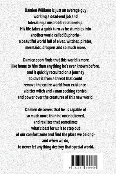 Damien Williams is just an average guy working a dead-end job and tolerating a miserable relationship. His life takes a quick turn as he stumbles into another world called Euphoria - a beautiful world full of elves, witches, pirates, mermaids, dragons and so much more. Damien soon finds that this world is more like home to him than anything he's ever known before, and is quickly recruited on a journey to save it from a threat that could remove the entire world from existence - a bitter witch and a man seeking control and power over the creatures of this new world. Damien discovers that he is capable of so much more than he once believed, and realizes that sometimes what's best for us is to step out of our comfort zone and find the place we belong - and when we do, to never let anything destroy that special world.