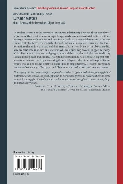 The volume examines the mutually constitutive relationship between the materiality of objects and their aesthetic meanings. Its approach connects material culture with art history, curation, technologies and practices of making. A central dimension of the case studies collected here is the mobility of objects between Europe and China and the transformations that unfold as a result of their transcultural lives. Many of the objects studied here are relatively unknown or understudied. The stories they recount suggest new ways of thinking about space, cultural geographies and the complex and often contradictory association of power and culture. These studies of transcultural objects can suggest pathways for museum experts by uncovering the multi-layered identities and temporalities of objects that can no longer be labelled as located in single regions. It is also addressed to students of art history, of European and Chinese studies and scholars of consumer culture.