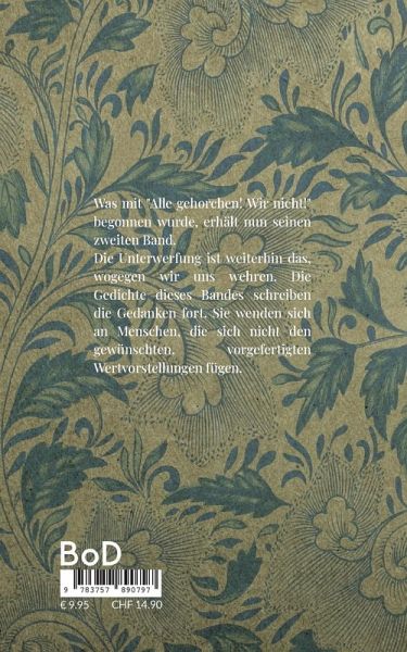 Was mit "Alle gehorchen! Wir nicht!" begonnen wurde, erhält nun seinen zweiten Band.Die Unterwerfung ist weiterhin das, wogegen wir uns wehren. Die Gedichte dieses Bandes schreiben die Gedanken fort. Sie wenden sich an Menschen, die sich nicht den gewünschten, vorgefertigten Wertvorstellungen fügen.