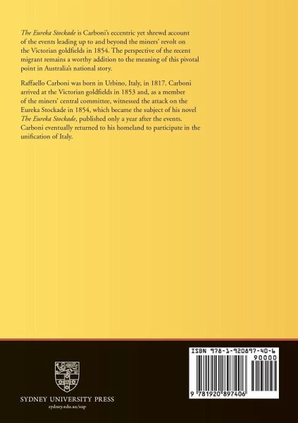 The Eureka Stockade is Carboni's eccentric yet shrewd account of the events leading up to and beyond the miners' revolt on the Victorian goldfields in 1854. Raffaello Carboni (1817-1875) was born in Urbino, Italy. He arrived at the Victorian goldfields in 1853 and witnessed the attack on the Eureka Stockade in 1854 as a member of the miners central committee. He eventually returned to Italy to participate in the Risorgimento.