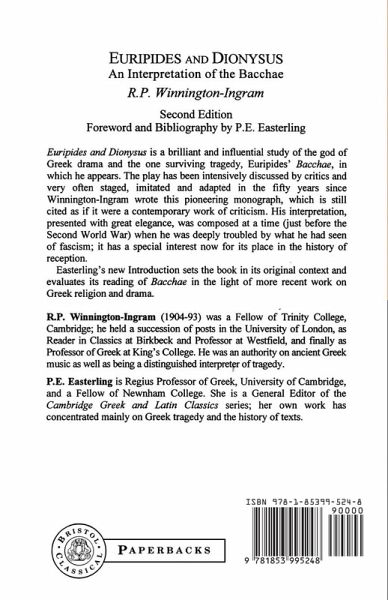 Euripides and Dionysus is a brilliant and influential study of the god of Greek drama and the one surviving tragedy, Euripides' Bacchae, in which he appears. The play has been intensively discussed by critics and very often staged, imitated and adapted in the years since Winnington-Ingram wrote this pioneering monograph, which is still cited as if it were a contemporary work of criticism. His interpretation, presented with great elegance, was composed at a time (just before the Second World War) when he was deeply troubled by what he had seen of fascism; it has special interest now for its place in the history of reception. P.E. Easterling's new Introduction sets the book in its original context and evaluates its reading of the Bacchae in light of more recent work on Greek religion and drama.