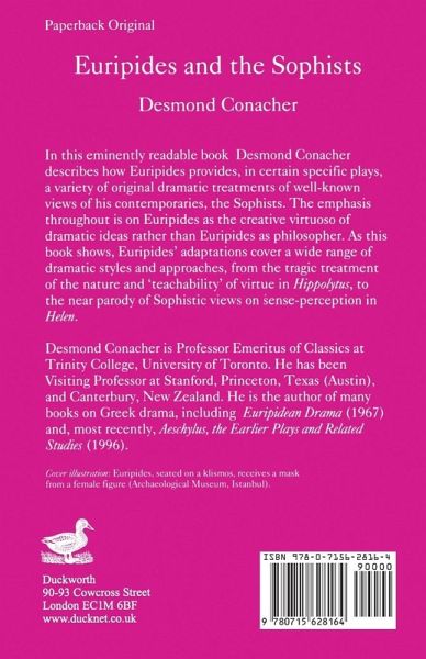 This work describes how Euripides provides, in specific plays, a variety of original treatments of well-known views of his contemporaries, the Sophists. The emphasis is on Euripides as the creative virtuoso of dramatic ideas rather than as a philosopher. Euripides' adaptation covers a range of dramatic styles and approaches, from the tragic treatment of the nature in "Hippolytus", to the near parody of Sophistic views on sense-perception in "Helen".