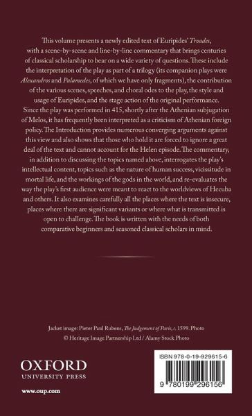 This volume presents a newly edited text of Euripides' Troades, with a scene-by-scene and line-by-line commentary that brings centuries of classical scholarship to bear on a wide variety of questions. These include the interpretation of the play as part of a trilogy (its companion plays were Alexandros and Palamedes, of which we have only fragments), the contribution of the various scenes, speeches, and choral odes to the play, the style and usage of Euripides, and the stage action of the original performance. Since the play was performed in 415, shortly after the Athenian subjugation of Melos, it has frequently been interpreted as a criticism of Athenian foreign policy. The Introduction provides numerous converging arguments against this view and also sshows that those who hold it are forced to ignore a great deal of the text and cannot account for the Helen episode. The commentary, in addition to discussing the topics named above, interrogates the play's intellectual content, topics such as the nature of human success, vicissitude in mortal life, and the workings of the gods in the world, and re-evaluates the way the play's first audience were meant to react to the worldviews of Hecuba and others. It also examines carefully all the places where the text is insecure, places where there are significant variants or where what is transmitted is open to challenge. The book is written with the needs of both comparative beginners and seasoned classical scholars in mind.