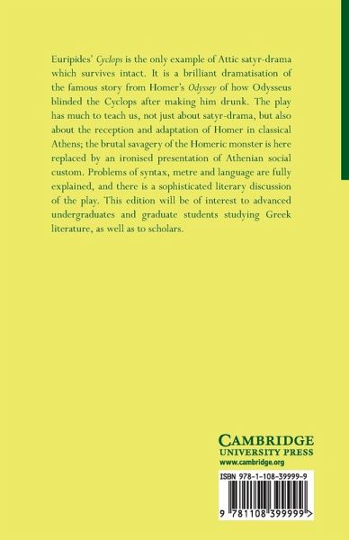 Euripides' Cyclops is the only example of Attic satyr-drama which survives intact and brilliantly dramatises the famous story from Homer's Odyssey of how Odysseus blinded the Cyclops after making him drunk. This full literary and linguistic commentary on the play is suitable for both advanced students and scholars.