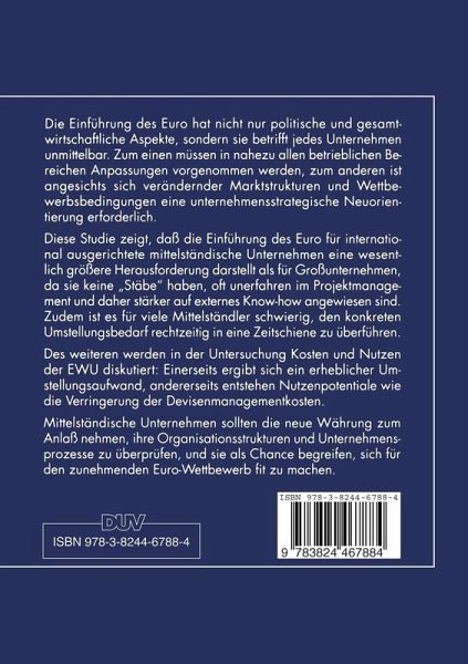 Die Einführung des Euro hat nicht nur politische und gesamtwirtschaftliche Aspekte, sondern sie betrifft jedes Unternehmen unmittelbar. Zum einen müssen in nahezu allen betrieblichen Bereichen Anpassungen vorgenommen werden, zum anderen ist angesichts sich verändernder Marktstrukturen und Wettbewerbsbedingungen eine unternehmensstrategische Neuorientierung erforderlich. Diese Studie zeigt, daß die Einführung des Euro für international ausgerichtete mittelständische Unternehmen eine wesentlich größere Herausforderung darstellt als für Großunternehmen, da sie keine "Stäbe", haben, oft unerfahren im Projektmanagement und daher stärker auf externes Know-how angewiesen sind. Zudem ist es für viele Mittelständler schwierig, den konkreten Umstellungsbedarf rechtzeitig in eine Zeitschiene zu überführen. Des weiteren werden in der Untersuchung Kosten und Nutzen der EWU diskutiert: Einerseits ergibt sich ein erheblicher Umstellungsaufwand, andererseits entstehen Nutzenpotentiale wie die Verringerung der Devisenmanagementkosten. Mittelständische Unternehmen sollten die neue Währung zum Anlaß nehmen, ihre Organisationsstrukturen und Unternehmensprozesse zu überprüfen, und sie als Chance begreifen, sich für den zunehmenden Euro-Wettbewerb fit zu machen.