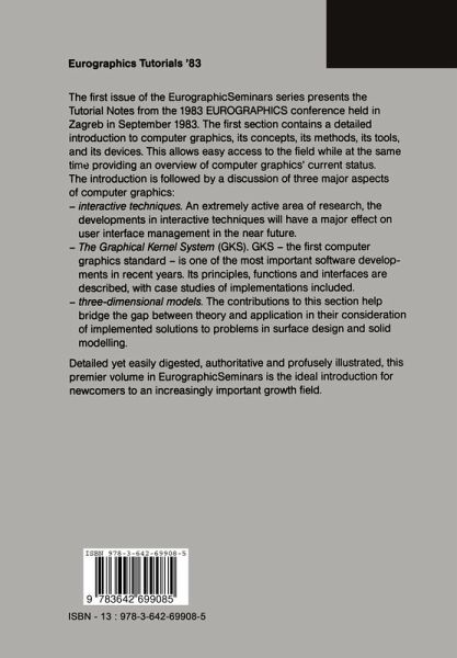 This book is the first issue of a EUROGRAPHICS publication series in the field of computer graphics, an important field of research and a versatile tool for various application areas. The availability of powerful hardware at an affordable price and the evolution of high standard software have led to a rapidly increas ing expansion of computer graphics and the penetration of compu ter graphics techniques and systems into a wide range of applica tion areas. This book series will cover state-of-the-art surveys as well as scientific contributions on specific areas of research and develop ment. The first book in the series contains the Tutorial Notes of the EUROGRAPHICS '83 conference, held in Zagreb, Yugoslavia, in September 1983. It covers four major aspects of computer graphics today: - The first part contains a detailed introduction into computer graphics, its concepts, its methods, its tools, and its devices. It gives an easy access for the newcomer to the field and it offers an overview of the state of the art in computer graphics. - The second part is devoted to interactive techniques. This is currently one of the most important fields of research in computer graphics. Important aspects of this research and its current state are reported. From the developments described here, in the near future powerful generally applicable user interface management systems are likely to evolve.