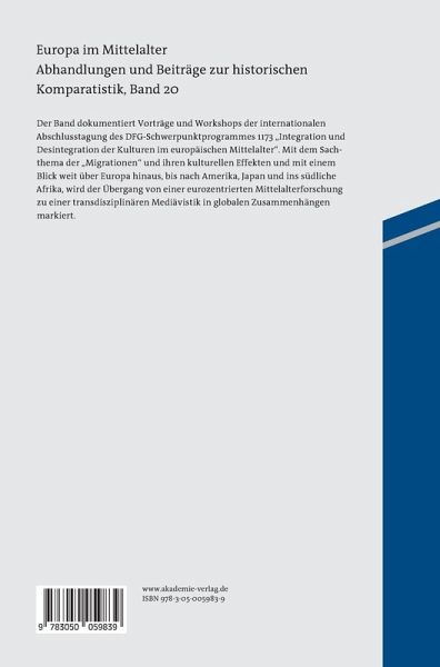 Der Band dokumentiert Vorträge und Workshops der internationalen Abschlusstagung des DFG-Schwerpunktprogrammes 1173 'Integration und Desintegration der Kulturen im europäischen Mittelalter', die Ende Mai 2011 in Berlin stattgefunden hat. Bei der Arbeit im Schwerpunktprogramm hatte sich gezeigt, wie schwierig es ist, Europa im geographischen und historischen Sinne vom Mittelmeerraum mit Nordafrika und Vorderasien zu trennen. Daher wurden die Grenzen des mittelalterlichen Europa bewusst überschritten und auch die Geschichte weiter entfernter Länder in den Blick genommen. Als thematischer Schwerpunkt boten sich in diesem Zusammenhang Migrationen an. Migrationen sind ja ein globales Phäno¬men, das an allen Orten und zu allen Zeiten immer wieder die Geschichte der Menschheit prägt und dabei unvermeidlich - selbst in der scheinbaren Isolation einer 'Diaspora' oder 'Parallelgesellschaft' - zu transkulturellen Verflechtungen führt. Fremde und einheimische Gruppen und Individuen werden in neue soziale Umgebungen gerückt und Kontakte oder Konflikte zwischen ihnen erzeugt. Wo aber das jeweilige Leben gegeneinander abgeschottet werden soll, verliert Kultur ihre Innovationskraft und versteinert die Gesellschaft.