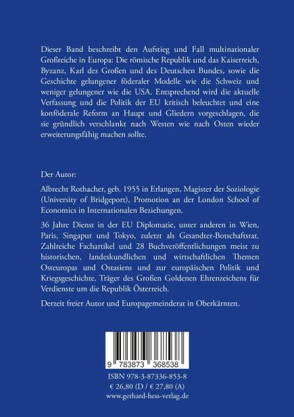 Dieser Band beschreibt den Aufstieg und Fall multinationaler Großreiche in Europa: Die römische Republik und das Kaiserreich, Byzanz, Karl des Großen und des Deutschen Bundes, sowie die Geschichte gelungener föderaler Modelle wie die Schweiz und weniger gelungener wie die USA. Entsprechend wird die aktuelle Verfassung und die Politik der EU kritisch beleuchtet und eine konföderale Reform an Haupt und Gliedern vorgeschlagen, die sie gründlich verschlankt nach Westen wie nach Osten wieder erweiterungsfähig machen sollte. Ohne Zweifel ist die Europäische Union heute in einer politischen und konzeptionellen Existenzkrise. In 70 Jahren hat sie sich in planlosen Kompromissen im Verein mit dem EuGH irrwitzige Kompetenzen angeeignet von der Agrar-, Regional- und Gesellschaftspolitik, über rechtswidrige Staatsschuldenprogramme von Kommission und EZB bis zu Verboten von Glühbirnen, Plastikstrohhalmen, Verbrennermotoren und Ölheizungen, die mit föderalen Konzepten und dem Subsidiaritätsprinzip nichts mehr zu tun haben und sie von den Bürgern sämtlicher Mitgliedstaaten gründlich entfremden. Deshalb wirft dieser Band einen Blick auf die Ideen der Urväter des europäischen Föderalismus: Friedrich List, Coudenhove-Kalergi und Jean Monnet. Er berichtet vom Aufstieg und Fall multinationaler Großreiche auf europäischem Boden: Der römischen Republik und dem Kaiserreich, den Nachfolgereichen von Byzanz und Karls dem Großen und bezieht die Ursachen ihres Untergangs auf die heutige EU: Der Verfall der Rechtsordnungen und Wirtschaftsorganisation, illegitime Herrscher, korrupte und amoralische Eliten, Bürgerkriege, sektiererische Religionskriege, der Verfall der Arbeitsmoral durch Sklavenarbeit und die Ansiedlung fremdkultureller Barbarenstämme, die nach und nach die Macht an sich rissen und die morsch und demographisch schwach gewordenen Reiche von innen zersetzten. Die Entwicklung der Schweiz wird als unstreitig erfolgreiches föderales Modell vorgestellt und das der USA als eines, das beherzigenswert lehrt, wie eine föderale Bürokratie und ein Präsidialsystem monströs werden kann. Sodann werden die gemischten föderalen Erfahrungen des Deutschen Bundes - wirtschaftlich erfolgreich, friedlich und politisch impotent - und des Bismarck Reiches, das die Macht des Kaisers nicht mehr kontrollieren konnte, als weitere Lehren dargestellt. Anhand der Entwicklung der Europäischen Union, Vertrag um Vertrag, und der Erfahrungen der Erweiterungen und des Brexit werden von der Agrar- und Außenpolitik bis zum klimawahngeleiteten "Green Deal" Fehlentwickungen dargestellt und Lösungen vorgeschlagen. Nach einer Reform der EU an Haupt und Gliedern könnten ohne die sinnlosen Reglementierungen und die Umverteilungsprogramme nach Süd- und Osteuropa 90 % des Haushalts eingespart werden und statt 27 Kommissaren bräuchte es nur noch deren sieben, justament die Größe der Schweizer Bundesregierung, deren Konkordanzdemokratie auch die EU übernehmen sollte. Als visionärer Ausblick für jene gründlichst reformierte EU: Eine Konföderation mit den demokratisierten Oststaaten Eurasiens als zivilisationsaffine Kulturkreise, um statt des aktuellen Niedergangs Europas in die Bedeutungslosigkeit, eine dritte, diesmal friedliche Weltmacht werden zu können.