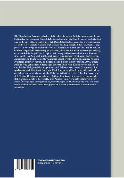 Die Religionsgeschichte im Okzident besitzt - wie jede religiöse Tradition - ein spezifisches Profil, so die These dieses Buches: In der Spätantike entstand ein neues Konzept religiöser Zugehörigkeit, das Europa fundamental und bis heute prägt: Menschen konnten einer "Religion" nicht mehr nur durch Geburt, sondern auch aufgrund einer Entscheidung angehören. Das klingt banal, revolutionierte aber das Religionssystem. Dies dokumentieren Erfindungen des frühen Christentums: ein Ritus zum Eintritt ("Taufe"), religiöse Unterweisung ("Katechese"), Ausbreitung jenseits ethnischer Grenzen ("Universalismus") durch "Mission" und "Konversion". Diese Elemente führten zu einem neuen, demjenigen Verständnis von "Religion", welches heute den umgangssprachlichen und religionswissenschaftlichen Religionsbegriff prägt.