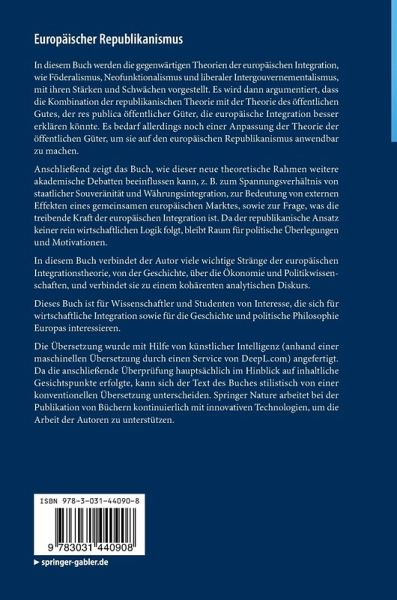 In diesem Buch werden die aktuellen Theorien der europäischen Integration, wie Föderalismus, Neofunktionalismus und liberaler Intergouvernementalismus, mit ihren Stärken und Schwächen vorgestellt. Es wird dann argumentiert, dass die Kombination der republikanischen Theorie mit der Theorie des öffentlichen Gutes, der res publica der öffentlichen Güter, die europäische Integration besser erklären könnte. Die Theorie der öffentlichen Güter muss jedoch übernommen werden, um sie auf den europäischen Republikanismus anwendbar zu machen. Schließlich zeigt das Buch, wie dieser neue Rahmen weitere akademische Debatten beeinflussen kann, z. B. über Souveränität und Währungsintegration, externe Effekte eines gemeinsamen europäischen Marktes und die treibende Kraft der europäischen Integration. Da der republikanische Ansatz nicht einer rein wirtschaftlichen Logik folgt, bleibt Raum für politische Überlegungen und Motivationen.