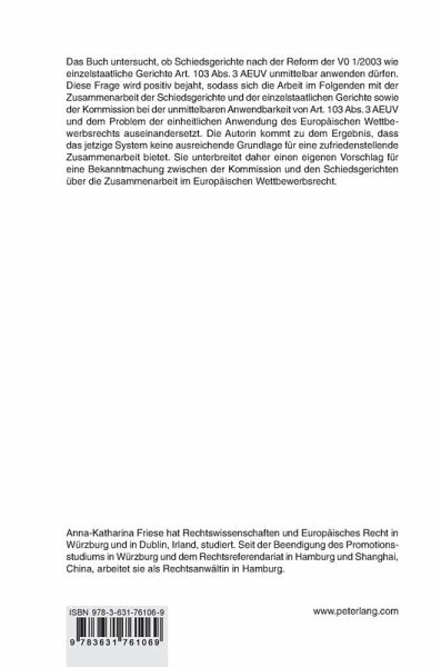 Das Buch untersucht, ob Schiedsgerichte nach der Reform der V0 1/2003 wie einzelstaatliche Gerichte Art. 103 Abs.3 AEUV unmittelbar anwenden dürfen. Diese Frage wird positiv bejaht, sodass sich die Arbeit im Folgenden mit der Zusammenarbeit der Schiedsgerichte und der einzelstaatlichen Gerichte sowie der Kommission bei der unmittelbaren Anwendbarkeit von Art. 103 Abs. 3 AEUV und dem Problem der einheitlichen Anwendung des Europäischen Wettbewerbsrechts auseinandersetzt. Die Autorin kommt zu dem Ergebnis, dass das jetzige System keine ausreichende Grundlage für eine zufriedenstellende Zusammenarbeit bietet. Sie unterbreitet daher einen eigenen Vorschlag für eine Bekanntmachung zwischen der Kommission und den Schiedsgerichten über die Zusammenarbeit im Europäischen Wettbewerbsrecht.