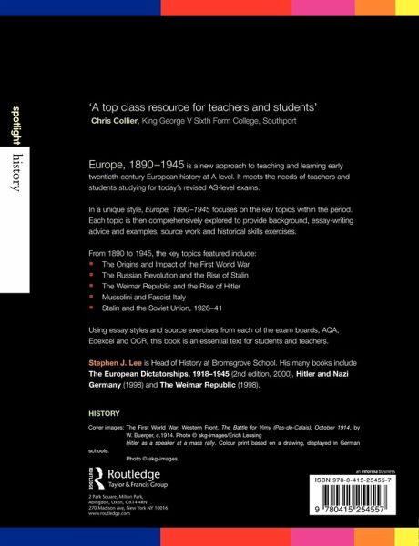 Europe, 1890-1945 is a new approach to teaching and learning early twentieth century European history at A level. It meets the needs of teachers and students studying for today's revised AS and A2 exams. In a unique style, Europe, 1890-1945 focuses on the key topics within the period. Each topic is then comprehensively explored to provide background information, essay writing advice and examples, source work, and historical skills exercises. From 1890 to 1945, the key topics featured include: * the origins and impact of the First World War * the Russian Revolution and the rise of Stalin * the Weimar Republic and the rise of Hitler * Mussolini and Fascist Italy * Stalin and the Soviet Union, 1928-41.