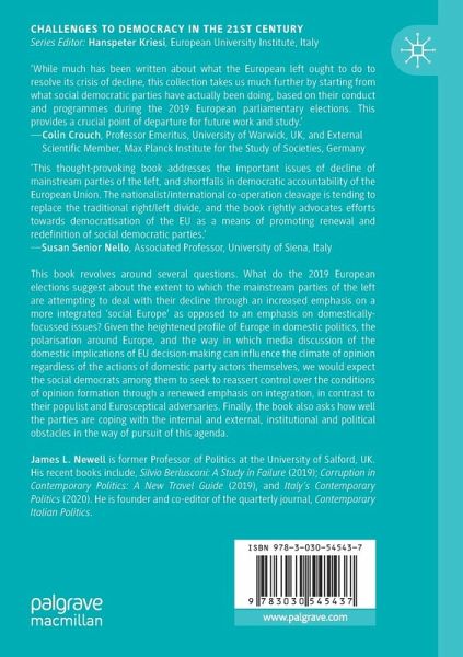 This edited volume revolves around two sets of questions. First, what do the 2019 European elections suggest about the extent to which the mainstream parties of the left are attempting to deal with their decline through an increased, common, emphasis on their project for a more integrated, 'social Europe' as opposed to an emphasis on the more 'traditional', domestically-focussed, issues? Given the heightened profile of Europe in domestic politics; given the polarisation around Europe; given the way in which (especially in the countries of the Eurozone) media discussion of the domestic implications of EU decision-making can influence the climate of opinion regardless of the actions of domestic party actors themselves, we would expect the social democrats among them to seek to reassert control over the conditions of opinion formation through a renewed emphasis on integration (as well as its benefits and its potential as a source of identities to rival national, exclusionary identities) in opposition to their populist and Eurosceptical adversaries. To what extent do the campaigns waged by these parties bear out this expectation? Second, how well are the parties coping with the internal and external, institutional and political obstacles in the way of pursuit of this agenda?