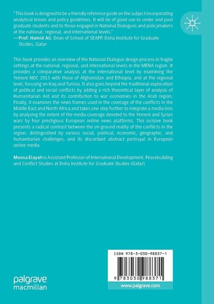 This book provides an overview of the National Dialogue design process in fragile settings at the national, regional, and international levels in the MENA region. It provides a comparative analysis at the international level by examining the Yemeni NDC 2013 with those of Afghanistan and Ethiopia, and at the regional level, focusing on Iraq and Tunisia. It also goes beyond the traditional exploration of political and social conflicts by adding a rich theoretical layer of analysis of Humanitarian Aid and its contribution to war economies in the Arab region. Finally, it examines the news frames used in the coverage of the conflicts in the Middle East and North Africa and takes one step further to integrate a media lens by analysing the extent of the media coverage devoted to the Yemeni and Syrian wars by four prestigious European online news platforms. This incisive book presents a radical contrast between the on-ground reality of the conflicts in the region, distinguished by various social, political, economic, geographic, and humanitarian challenges, and its discordant abstract portrayal in European online media.