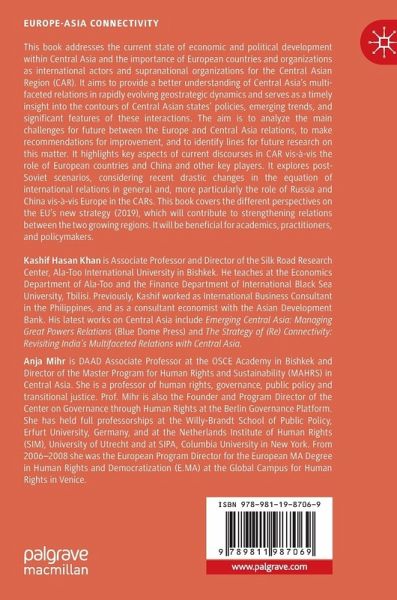 1. Introduction and Background to the Book (Kashif Hasan Khan & Anja Mihr).- I Contextual overview of European policies towards Central Asia.-. 2 Assessing Europe - Central Asia Connectivity through Linkage and leverage (Ana-Maria Anghelescu).- 3 The Policies of the European Union and Russia vis-à-vis Central Asia (Agnieszka Kuszewska).- 4 The 2019 European Union Strategy on Central Asia: Future Challenges (Ana Belén Perianes Bermúdez).- 5 The European Union's Sustainability Standardisation of World Trade: A Challenge for Central Asia? (Axel Marx & Nazik Beishenaly).- 6 Development of Central Asia and European Union's Assistance Programme (Bedelbai Mamadiev).- II Central Asia's Connectivity: Human Rights, Rule of Law and Good Governance.- 7 Human Rights in Central Asian States and European Initiatives (Anja Mihr).- 8 European-Central Asian International Election Obser-vation cooperation (Rick Fawn).- 9 Implementing Good Governance in the Framework of Europe's New Strategy for Central Asia: Lessons from the Baltics (Ivo Rollis).- III Old Games in New Frameworks: Regional and Geopolitical Perspectives.- 10 Great Game vs Small Game: Europe, India, and Japan in Central Asia (Raj Kumar Sharma).- 11 Regional Connectivity and the China factor (Bipul Biplav Mukherjee).- 12 EU-Central Asian Cooperation on Border Manage-ment, Migration and Mobility (Ildar Daminov).