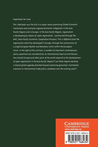 This book was the first in a major series examining Global Economic Institutions and contrasts regional economic integration in the Asia Pacific Region and in Europe. In the Asia Pacific Region at the time of publication, regionalism was developing by means of 'open regionalism', constructed through the APEC (Asia Pacific Economic Cooperation Process). This was different from the regionalism which had developed in Europe, through the construction of a single European Market and Monetary Union within the European Union. In the light of this contrast, a number of important contemporary policy questions are considered by an international team of contributors. How should Europe and other parts of the world respond to the development of open regionalism in the Asia Pacific Region? Can these regions develop a shared global agenda directed toward sustaining genuinely multilateral solutions to international trade policy problems?