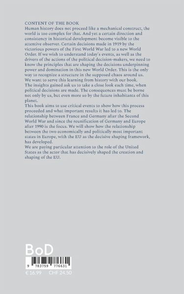 CONTENT OF THE BOOK Human history does not proceed like a mechanical construct, the world is too complex for that. And yet a certain direction and consistency in historical development become visible to the attentive observer. Certain decisions made in 1919 by the victorious powers of the First World War led to a new World Order. If we wish to understand today's events, as well as the drivers of the actions of the political decision-makers, we need to know the principles that are shaping the decisions underpinning power and domination in this new World Order. This is the only way to recognize a structure in the supposed chaos around us. We want to serve this learning from history with our book. The insights gained ask us to take a close look each time, when political decisions are made. The consequences must be borne not only by us, but even more so by the future inhabitants of this planet. This book aims to use critical events to show how this process proceeded and what important results it has led to. The relationship between France and Germany after the Second World War and since the reunification of Germany and Europe after 1990 is the focus. We will show how the relationship between the two economically and politically most important states in Europe, with the EU as the decisive shaping framework, has developed. We are paying particular attention to the role of the United States as the actor that has decisively shaped the creation and shaping of the EU.