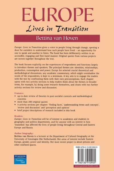 First published in 2003. Europe: lives in transition gives a voice to people living through transition, opening a door for outsiders to understand how such people have lived - an opportunity for one to speak and another to listen. The book has been deliberately written in an accessible, engaging and first-hand manner. Original quotes from various projects are woven together throughout the text.This book focuses explicitly on the experiences of respondents and functions largely to introduce themes and speakers. The principal themes are: identities, relationships, production, consumption and power. Except for selected crucial theoretical and methodological discussions, any academic commentary, which might overshadow the words of the respondents, is kept to a minimum. A key aim is to engage the readers with the text by confronting them with their own preconceptions and geographical imaginations. Each chapter opens with two activity sections to help readers think about the themes in broader terms, for example, by doing some research themselves. Each chapter closes with two further activity sections for review and discussion.