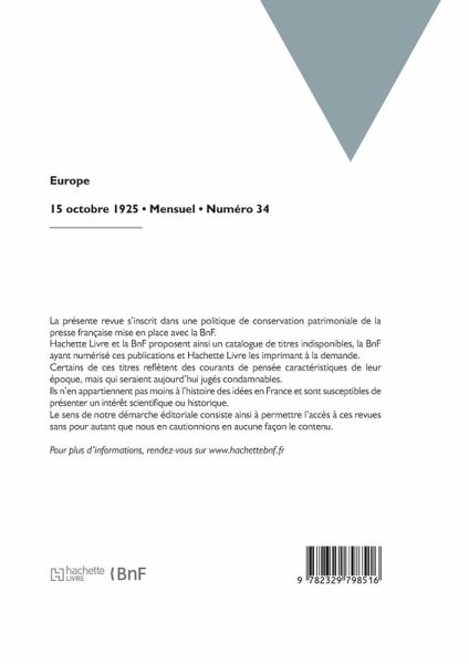 Europe: revue mensuelle Date de l'édition originale: 1925-10-15 La présente revue s'inscrit dans une politique de conservation patrimoniale de la presse française mise en place avec la BnF. Hachette Livre et la BnF proposent ainsi un catalogue de titres indisponibles, la BnF ayant numérisé ces publications et Hachette Livre les imprimant à la demande. Certains de ces titres reflètent des courants de pensée caractéristiques de leur époque, mais qui seraient aujourd'hui jugés condamnables. Ils n'en appartiennent pas moins à l'histoire des idées en France et sont susceptibles de présenter un intérêt scientifique ou historique. Le sens de notre démarche éditoriale consiste ainsi à permettre l'accès à ces revues sans pour autant que nous en cautionnions en aucune façon le contenu. Pour plus d'informations, rendez-vous sur www.hachettebnf.fr