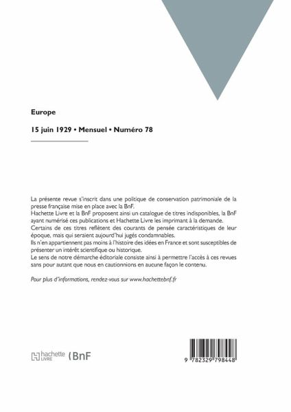 Europe: revue mensuelle Date de l'édition originale: 1929-06-15 La présente revue s'inscrit dans une politique de conservation patrimoniale de la presse française mise en place avec la BnF. Hachette Livre et la BnF proposent ainsi un catalogue de titres indisponibles, la BnF ayant numérisé ces publications et Hachette Livre les imprimant à la demande. Certains de ces titres reflètent des courants de pensée caractéristiques de leur époque, mais qui seraient aujourd'hui jugés condamnables. Ils n'en appartiennent pas moins à l'histoire des idées en France et sont susceptibles de présenter un intérêt scientifique ou historique. Le sens de notre démarche éditoriale consiste ainsi à permettre l'accès à ces revues sans pour autant que nous en cautionnions en aucune façon le contenu. Pour plus d'informations, rendez-vous sur www.hachettebnf.fr