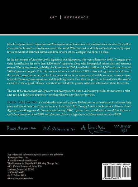 John Castagno's Artists' Signatures and Monograms have become the standard reference source for galleries, museums, libraries, and collectors around the world. European Artists III: Signatures and Monograms From 1800, A Directory features an additional 2,800 artists and signatures. In addition to the standard signature entries, the book features sections for monograms and initials, common surname signatures, alternative surname signatures, and illegible signatures. It provides the researcher a reference tool not duplicated elsewhere-one that will save many hours of research.