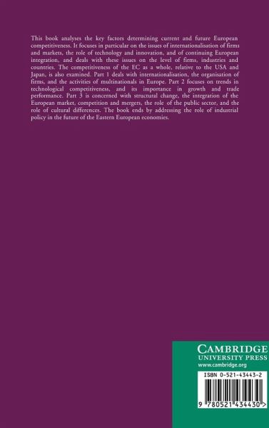 This book analyses the key factors determining current and future European competitiveness. It focuses in particular on the issues of internationalisation of firms and markets, the role of technology and innovation, and of continuing European integration, and deals with these issues on the level of firms, industries and countries. The competitiveness of the EC as a whole, relative to the US and Japan, is also examined. Part I deals with internationalisation, the organisation of firms, and the activities of multinationals in Europe. Part II focuses on trends in technological competitiveness, and its importance in growth and trade performance. Part III is concerned with structural change, the integration of the European market, competition and mergers, the role of the public sector, and the role of cultural differences. The book ends by addressing the role of industrial policy in the future of the Eastern European economies.