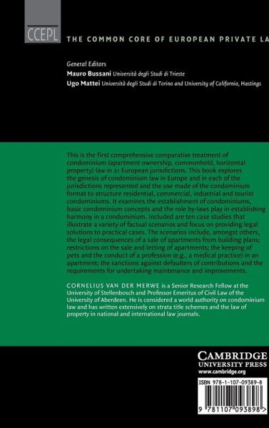 This is the first comprehensive comparative treatment of condominium (apartment ownership, commonhold, horizontal property) law in 21 European jurisdictions. This book explores the genesis of condominium law in Europe and in each of the jurisdictions represented and the use made of the condominium format to structure residential, commercial, industrial and tourist condominiums. It examines the establishment of condominiums, basic condominium concepts and the role by-laws play in establishing harmony in a condominium. Included are ten case studies, which illustrate a variety of factual scenarios and focus on providing legal solutions to practical cases. The scenarios include, amongst others, the legal consequences of a sale of apartments from building plans; restrictions on the sale and letting of apartments; the keeping of pets and the conduct of a profession (such as a medical practice) in an apartment; the sanctions against defaulters of contributions; and the requirements for undertaking maintenance and improvements.