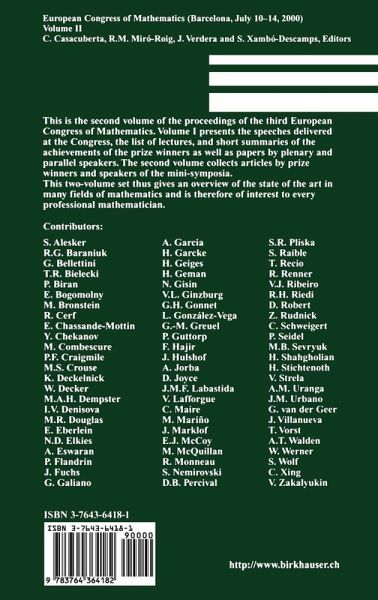 This is the second volume of the proceedings of the third European Congress of Mathematics. Volume I presents the speeches delivered at the Congress, the list of lectures, and short summaries of the achievements of the prize winners as well as papers by plenary and parallel speakers. The second volume collects articles by prize winners and speakers of the mini-symposia. This two-volume set thus gives an overview of the state of the art in many fields of mathematics and is therefore of interest to every professional mathematician.